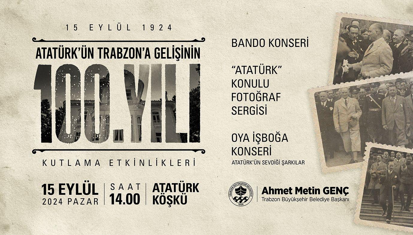 Trabzon Büyükşehir Belediyesi, Gazi Mustafa Kemal Atatürk’ün Trabzon’a gelişinin 100. yıl dönümü dolayısıyla etkinlikler düzenleyecek. Günün anısına Atatürk Köşkü gün boyunca ziyaretçilere ücretsiz olacak.Trabzon Büyükşehir Belediyesi, Gazi Mustafa Kemal Atatürk’ün 15 Eylül 1924’te Trabzon’u ziyaret etmesinin 100. yılı dolayısıyla bir dizi etkinlik düzenleyecek. Kültür ve Sosyal İşler Dairesi Başkanlığı tarafından Büyük Önder Mustafa Kemal Atatürk'ün konakladığı, manevi miras açısından büyük öneme sahip Atatürk Köşkü’nde 15 Eylül 2024’te saat 13.30'da Trabzon Büyükşehir Belediyesi Bandosu konser verecek. Saat 14.00’da köşk bahçesinde Atatürk’ün Trabzon’da çekilen fotoğraflarından oluşan sergi açılacak, saat 14.30’da da Atatürk’ün Trabzon ziyaretini anlatan belgeselin gösterimi yapılacak. Saat 15.00’da ise sanatçı Oya İşboğa, Atatürk’ün sevdiği şarkıları seslendirecek. Etkinlik zeybek gösterisi ile sona erecek. BU GURURU BİRLİKTE YAŞAYALIM