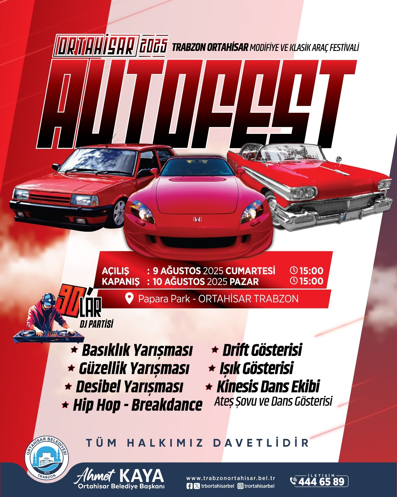 Gençlerin sosyal ve kültürel taleplerine önem verdiklerini ifade eden Ortahisar Belediye Başkanı Ahmet Kaya, “Trabzon’da sosyal aktivitelerin artması gerektiğine inanıyoruz ve bu anlamda gençlerimizin bizlerden taleplerini önemsiyoruz, gereken desteği vermeye çalışıyoruz. Önceki yıllarda da şehrimizde düzenlenen AutoFest 2025 Ortahisar Modifiye ve Klasik Araç Festivali’ne ev sahipliği yapacak olmanın heyecanını yaşıyoruz. Bu yıl belediyemizin destekleriyle daha geniş ve kapsamlı bir program hazırlandı. 7’den 70’e çok sayıda insanın ilgisini çeken, tutkusu haline gelen modifiye ve klasik araçların görücüye çıkacağı, daha birçok heyecan dolu etkinliğin yer alacağı AutoFest 2025 Ortahisar Modifiye ve Klasik Araç Festivali’ne tüm halkımızı davet ediyorum” dedi.