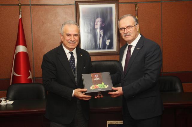 Organize Sanayi Bölgeleri Üst Kuruluşu (OSBÜK) Yönetim Kurulu Başkanı Memiş Kütükcü ve Yönetim Kurulu Üyeleri, Trabzon Ticaret Borsası’nı (TTB) ziyaret ederek çeşitli konularda görüş alışverişinde bulundular.TTB Yönetim Kurulu Başkanı Eyyüp Ergan ve yönetim kurulu üyelerinin karşıladığı heyete Arsin OSB Başkanı Dursun Ali Sakarya’da eşlik etti.Ziyarette OSBÜK heyetine, başta en önemli ihraç ürünümüz fındık olmak üzere Trabzon’un ekonomisine etki yapıp katkıda bulunan tarımsal ürünler olmak üzere bilgiler aktarıldı.TTB Başkanı Eyyüp Ergan, özellikle fındıkta son yıllarda Türkiye’de ve Dünya da yaşanan gelişmeler hakkında bilgi verirken, üretim ve dolayısı ile ticaretinde azalan payımızın yeniden eski seviyelerine yükselebilmesi için borsa olarak 20 yılı aşkın bir süredir verim ve kaliteyi arttırma çalışmaları yaptıklarını, özellikle üretim de maliyeti düşürmek için makineli tarıma yönelmenin öncelikli olması içinde çaba sarf ettiklerini söyledi. OSBÜK Yönetim Kurulu Başkanı Memiş Kütükcü’de, Türkiye’deki OSB’lerin alt yapı kalitelerinin sürekli olarak arttığına dikkat çekerek, bunun da müteşebbisleri yatırım yapmaya teşvik ettiğine dikkat çekti.