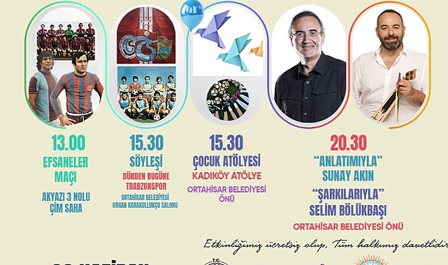 Program kapsamında Trabzon’da yapılacak etkinlikler 23 Haziran Pazartesi günü (yarın) Ortahisar Belediyesi tarafından düzenlenecek. Trabzon programında Türk edebiyatının sevilen isimlerinden Sunay Akın anlatımıyla, Kemençe üstadı Selim Bölükbaşı şarkılarıyla birlikte Kuzey’in Oğlu Volkan Konak’ın anılarını yaşatacak. Ortahisar Belediyesi’nin etkinlikleri arasında Efsaneler Maçı, Dünden Bugüne Trabzonspor söyleşisi, dinleti ve çocuk atölyesi yer alıyor. BAŞKAN KAYA, HALKI ETKİNLİKLERE DAVET ETTİ