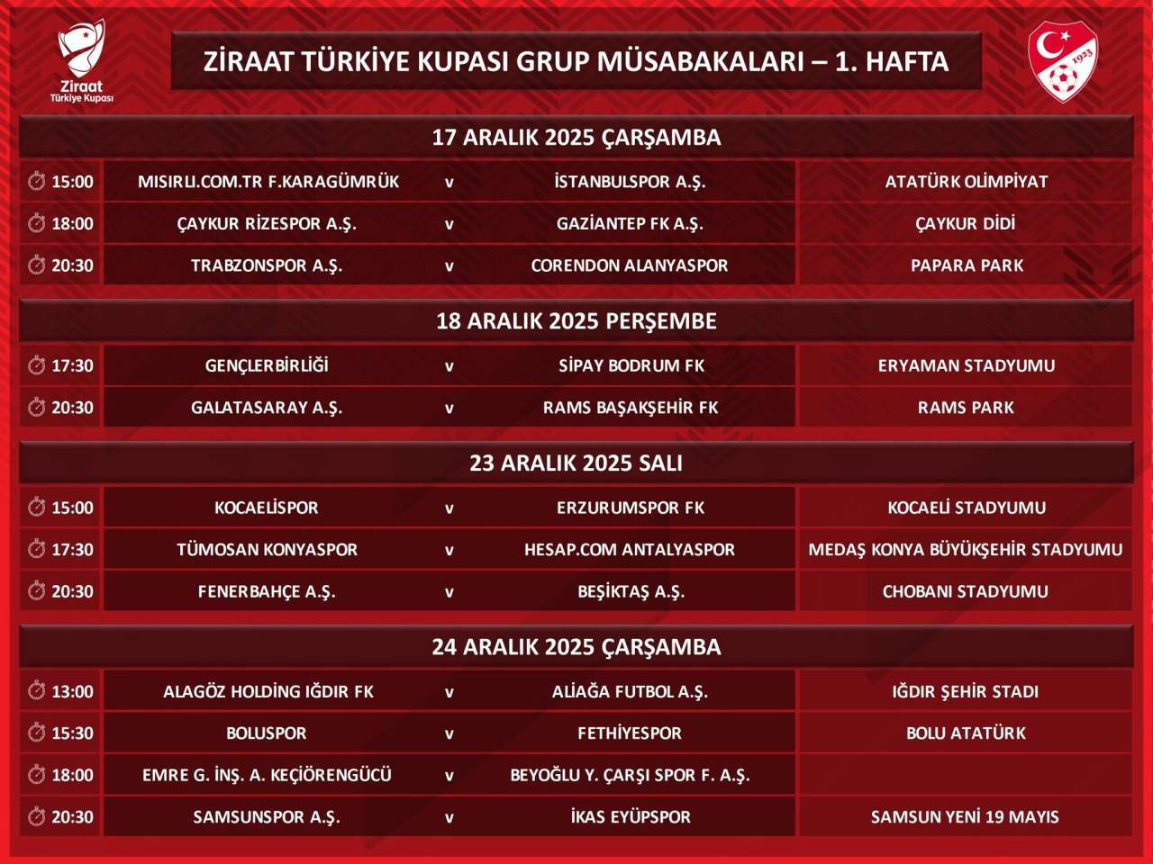 Ziraat Türkiye Kupası grup müsabakalarının ilk hafta fikstürü resmen duyuruldu. Yoğun maç takviminde Trabzonspor’un karşılaşacağı rakip ve müsabaka saati de belli oldu.Açıklanan programa göre Trabzonspor, 17 Aralık 2025 Çarşamba günü sahaya çıkacak. Bordo-mavililer, Papara Park’ta saat 20.30’da Coresdon Alanyaspor ile karşı karşıya gelecek.